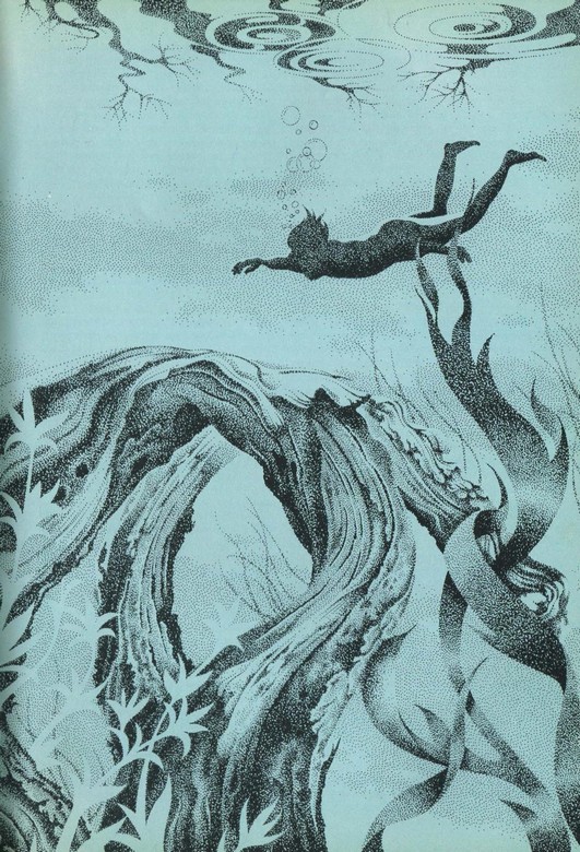 Ныряя в первый раз, он всегда заходил слева от ивы, где от него требовалось всего лишь миновать пару пней, которые при малейшей ошибке в расчете, вышибли бы из него весь дух. В это первое погружение, когда вода шумит в ушах и от его раскинутых рук клубами поднимается ил, наступало расслабление. Мир вмиг оказывался замкнут берегом, небо превращалось в кусочки синевы в листве, и пока не приходило время вновь одеваться, он не чувствовал разницы между собой и обитателями реки выдрами, водяными крысами, пескарями и лягушками. Ему доставляло такое же удовольствие выискивать добычу в иле или, лежа на спине, взбивать белую пену, столь же неожиданную на этой спокойной воде, как мелькнувший из-под коричневого домотканого подола краешек нижней юбки.