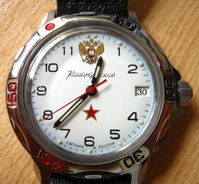 [1] «Командирские» часы появились в 1965 году для Министерство обороны СССР. Так как часы не предназначались для свободной продажи, то на них надпись «Сделано в С ССР» была заменена на «Заказ МО СССР».