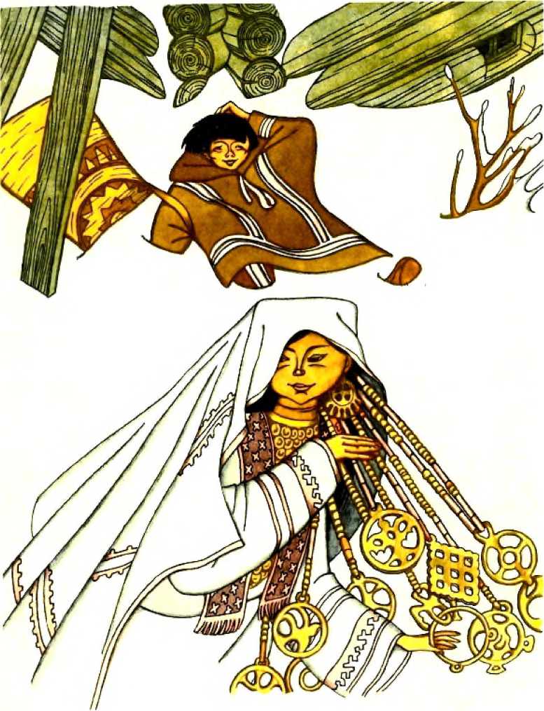 Тут вышла из дома девушка. Глянул на нее Ими-Хиты, чуть с крыши не свалился. Брови у девушки, как летящая птица, косы, как поющая птица, поведет головой слышен звон серебра и золота.