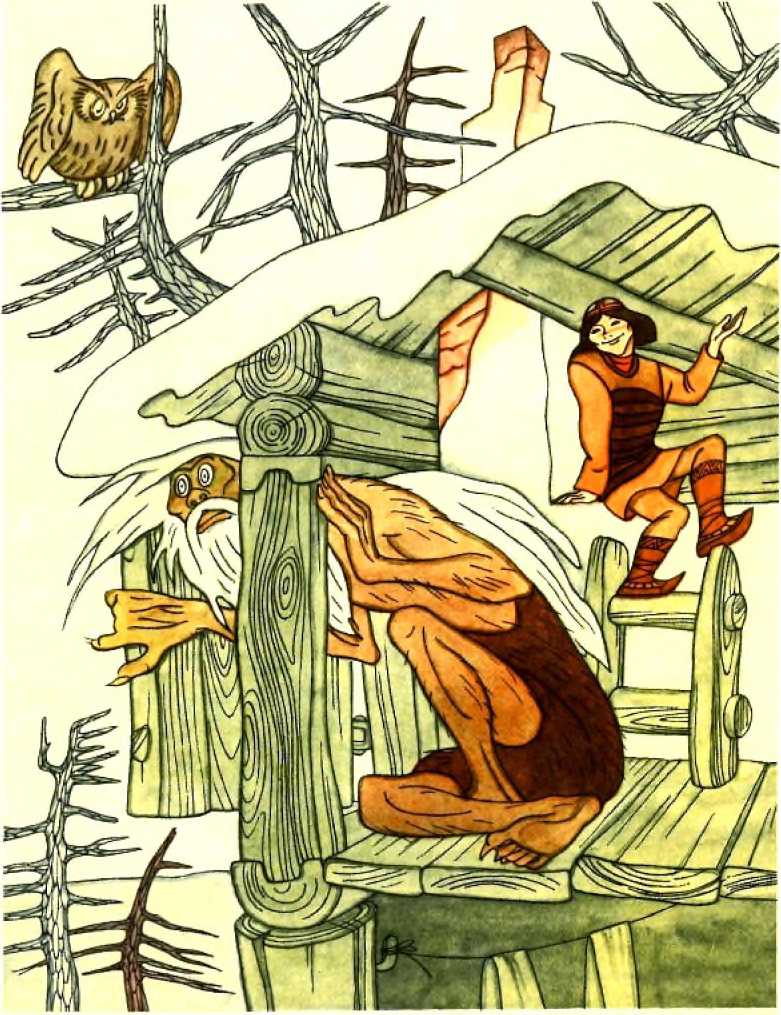 Знаю, отвечает младший охотников сын. Горшок твоя голова, шердын твое тулово, грабли твои руки, толчея твои моги. Если не пустишь меня ночевать, разобью я твою голову, изломаю руки-ноги, разрублю на куски тулово.