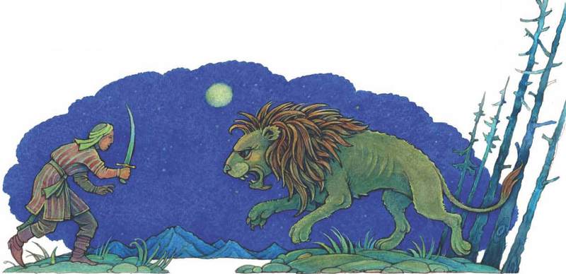 стражем был старший брат Тонгуч-батыр. Долго сидел он с мечом наготове. Ночь была лунная, и степь была видна далеко во все стороны, только лес впереди темнел широкой полосой. Долго стояла мертвая тишина. Вдруг со стороны леса послышался какой-то звук. Это лев вышел на запах людей в степь из своего логова.