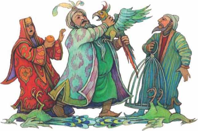 Но испугался шах, что не вернется его любимец, если улетит так далеко. Не захотел его отпустить. Попугай стал уговаривать шаха: