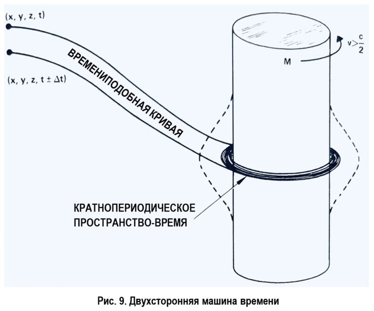 Если предположить, что вращающаяся масса имеет форму ультраплотного кольца массой M и электрическим, либо магнитным зарядом Q (см. рис. 11), то с помощью метрики Керра можно показать [9, 10], что при достаточной плотности и скорости вращения кольца оно будет совмещать в себе свойства пространственной деформации и машины времени. Когда небольшое тело проходит сквозь горловину кольца, оно не выходит из машины с противоположной стороны!