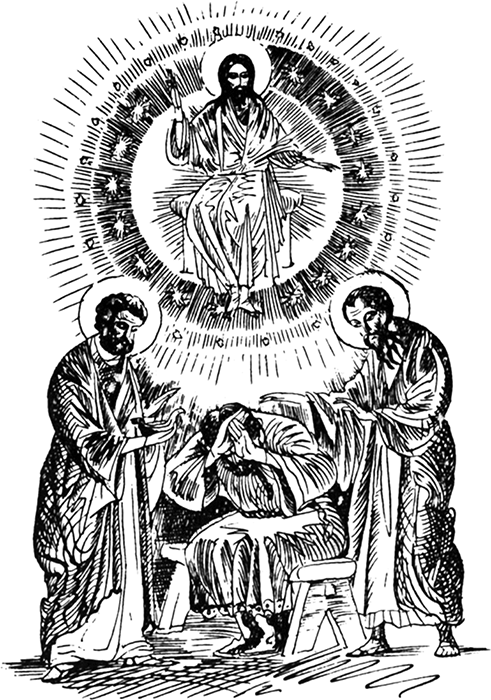 Осторожно отвел он от лица руки и видит свет исчез, а перед ним в блистающих одеждах стоят седобородые апостолы Павел и Петр .