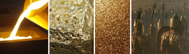 Разобрались с ананасами, перекурили, а нас уже обратно к импровизированной печи зовут золото начало плавиться. В смысле именно золото, а платина так и осталась кучкой в виде песка, только уже не сероватого, а раскалённого до ярко-оранжевого цвета, начинающего переходить в жёлтый. И сам "противень" уже жёлтый и пышущий жаром, и по нему от кучки желтеющего платинового песка стекает в уголок тоненький ручеёк то ли белесо-желтоватого, то ли вообще слегка зеленоватого цвета, судя по уже скопившейся в уголке лужице. И этот цвет нашего финикийского союзника заметно обрадовал. Он тут же послал одного из своих людей к кораблям, и тот вскоре вернулся с небольшой литейной формой и железными кузнечными клещами. Форму подсунули под уголок "противня" с ярко светящейся бледно-зеленоватой лужицей, а два наших турдетана подсунули свои саунионы под противоположный край и приподняли, давая расплавленному золоту стечь тоненькой струйкой в форму. Оттащили, дали остыть, перевернули, выколотили из формы маленькую, но увесистую ноздреватую отливку.