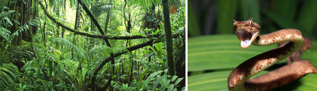 Вот змеи это да, это посерьёзнее. Есть, конечно, и в Испании гадюки, и яд у них даже несколько посильнее, чем у наших подмосковных ближе к нашим южным типа астраханских, но один хрен гадюка есть гадюка не гюрза это и не эфа, которые, кстати, не только в нашей Средней Азии водятся, но и в Северной Африке тоже. Но к северу от Гибралтара их нет, а есть только обыкновенная европейская гадюка. Крайне редко когда её укусы смертельны для здорового взрослого человека, обычно вычухиваются даже без оказания помощи. И вот на фоне этих не шибко страшных испанских гадюк и полного отсутствия вообще каких бы то ни было ядовитых змей на Больших Антилах, местные материковые ямкоголовые это, конечно, что-то с чем-то. Прежде всего по причине наибольшей распространённости здесь и сейчас и наивысшей, следовательно, вероятности встречи уже достаточно хорошо знакомая нам копьеголовая куфия или, она же ботропс цепкохвостый. Пострашнее её, но и попадается в дикой сельве, хвала богам, значительно реже, вот эта встреченная нами сегодня, да ещё и наделавшая переполоху лабария, она же кайсака. Она и крупнее, и яд у неё гораздо сильнее, и сама она гораздо агрессивнее той куфии, но реже встречается, гораздо реже.