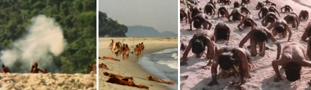 В ожидании толмача я рассказал вождю по-русски его родословную, начиная от скотоложства его дальнего пращура в хрен знает каком поколении с андскими ламами и заканчивая такого же сорта шалостями евонной мамаши с кабанчиком пекари. Потом уже подошёл наконец переводчик, и я уже по-финикийски спросил их главное пернатое чудо, когда нам его засолить, чтоб не портился до расстрела или после. Уж что там понял сам толмач, его спрашивайте, но что-то он таки вождю перевёл. Тот сбледнул, насколько это вообще реально для красножопого, растерянно осмотрелся по сторонам, а потом вдруг пополз вправо, перелезая через соплеменников, хвать одного за волосья, да каменным ножиком по кадыку. И лопочет чего-то, довольный и даже почти счастливый. Я к толмачу оборачиваюсь, а он переводит, что вождь глубоко сожалеет о случившемся, и вообще, он тут ни при чём, это всё вот этот, зарезанный им только что, и теперь он предлагает нам его зажарить и съесть в знак примирения. Мы прихренели от такого радушия, переглянулись и покачали головами, а главный дикарь, приободрившись от ловкого перевода стрелок и спасения собственной сановной задницы, подал знак бабам, чтоб спешили за закусью и приправами. Я объяснил этому миролюбивому людоеду, что мясом человекообразных обезьяньих говнюков мы не питаемся. Переводчик перевёл, как понял сам и сумел, вождь озадачился и зачесал загривок, но тут вернулись ихние бабы со снедью, и среди них оказалось несколько очень даже недурных.