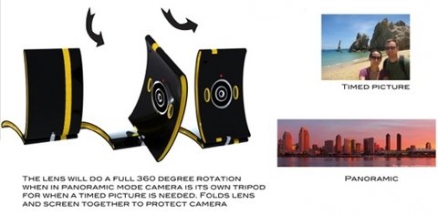 "Раскладушка" из экрана и камеры не только изящно выглядит - такая конструкция ещё и полезна. Половинки свободно крутятся друг относительно друга, благодаря чему объектив можно зафиксировать практически под любым углом. Автор концепции предполагает, что это позволит, к примеру, удобнее снимать панорамы.