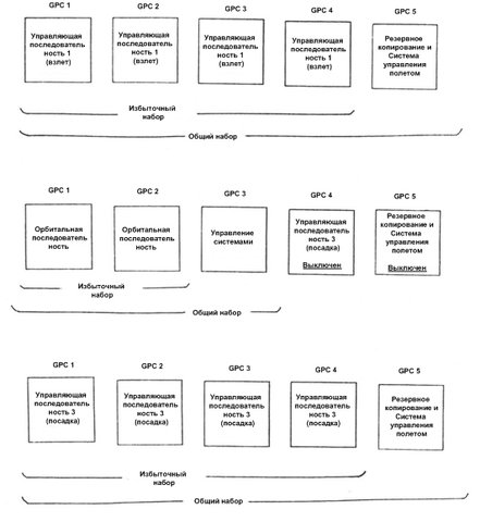 Как же происходит то самое избыточное голосование, "вычисляющее" неисправный компьютер? GPC, слушая командующие ЭВМ, дублировано выполняют их микропрограммы. Выполнение каждой из них компьютеры завершают формированием трехбитного кода, однозначно определяющего вид процедуры (например, "010 - вывод выполнен без ошибки"). Если все компьютеры из избыточного набора генерируют один и тот же код, значит всё в норме, если же один или даже два из них врут, три оставшиеся с правильным кодом могут понять, кто из пятерки сбоит.