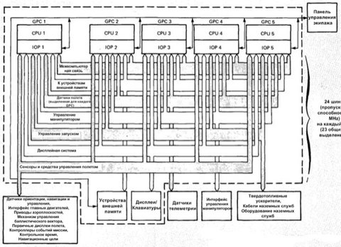 Каждый из пяти GPC был интегрирован с процессором ввода/вывода (Input/Output Processor - IOP). К каждому из пяти IOP, разделяющих память со "своим" GPC, подключено целых 24 шины! Все подсистемы корабля с помощью мультиплексоров могут одновременно работать с нужными им шинами. Так, пять шин используются для взаимодействия пяти GPC, через четыре шины работают дисплеи системы DEU, к двум шинам подключены два устройства внешней памяти на магнитной ленте (MMU). Остальные шины используются системой телеметрии и авионики корабля.