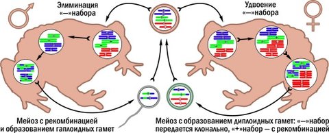Размножение пуштунских жаб Bufo baturae . Унаследованный от одного вида-родителя "-"-набор (красный) передаётся клонально, "+"-наборы от другого вида - рекомбинантно