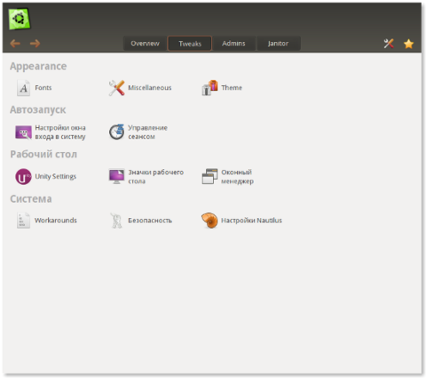 Чтобы не засорять систему лишними программами, можно поставить Ubuntu Tweak из ppa:tualatrix/next. В репозитории доступны две версии программы - из ветки 0.5 (ubuntu-tweak-0), а также из нестабильной ветки - 0.6 alpha (ubuntu-tweak). О первой подробно рассказывать не стоит - это старая версия, адаптированная для Ubuntu 11.10. Вторая гораздо интересней - из неё убрали возможности работы с репозиториями и установки программ (это логично: нет смысла дублировать активно развивающийся "Центр приложений Ubuntu"), но добавили функции настройки Unity, шрифтов, тем и т.д.