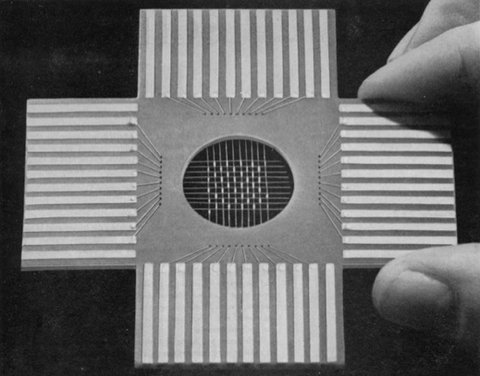 Правда, без ферритовых колец в твистор памяти не обошлось. Закрепленные на каждой из медных шин, они играют роль соленоида, передающего индукционный ток на адресные кабели, идущие к центральной шине ЭВМ.