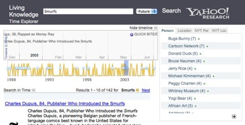 В исследовательской лаборатории компании Yahoo, находящейся в Барселоне, разработан прототип поисковой системы по новостям Time Explorer. Он генерирует временную шкалу (таймлайн), который не только показывает, как развивались уже произошедшие события, но и демонстрирует те, которые ещё только должны случиться.