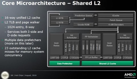 Архитектура Bulldozer предусматривает общую кэш-память второго уровня для двух "ядер". Кроме того, в чипах будет использоваться и кэш третьего уровня, общий для всех "ядер" и двухъядерных модулей.