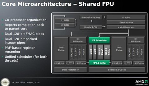 Микроархитектура Bulldozer совместима со стандартными инструкциями x86 и поддерживает дополнительные наборы инструкций SSE4.1, SSE4.2, AVX, AES и LWP. В отличие от Intel Core, современные чипы AMD не работают с мультимедийными инструкциями SSE4.1/4.2, так что их поддержка в процессорах следующего поколения позволит существенно повысить их производительность при работе с цифровыми изображениями и видео. Проприетарный набор инструкций SSE4a в чипах AMD текущего поколения это совершенно другой пакет, несовместимый с SSE4.1/4.2.