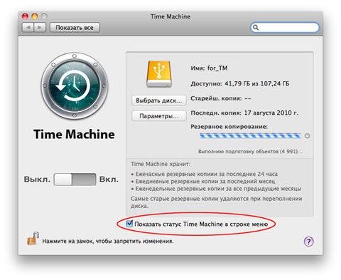 , необходимо в окне настроек Time Machine установить флажок Показать статус Time Machine в строке меню (Show Time Machine status in the menu bar).
