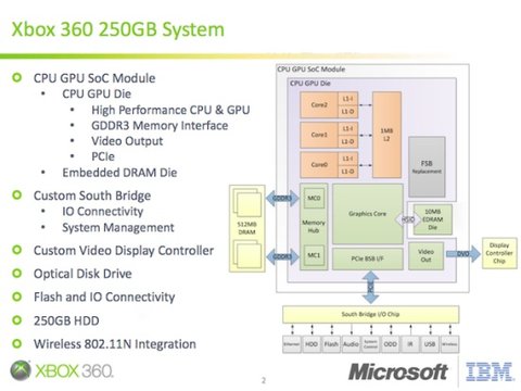 Перед инженерами стояла достаточно сложная задача, ведь быстродействие системы не должно было измениться (то, что приставке уже пять лет, никак не умаляет их заслуг). Что же собой представляет сама система на кристалле? Если посмотреть на схему, то можно увидеть трёхъядерный центральный процессор, графический процессор производства ATI, двухканальный контроллер памяти, а также блок ввода-вывода.