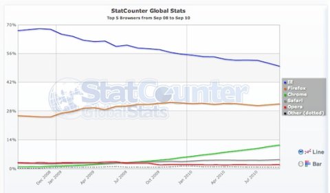 По данным компании StatCounter, доля Internet Explorer на рынке браузеров впервые за десятилетие упала ниже 50% до 49,9%. Ещё год назад в руках Microsoft было 67% рынка. Конечно, тут стоит учитывать, что эта информация базируется исключительно на исследованиях StatCounter, но эта фирма учитывает миллиарды визитов на миллионы сайтов, так что доверять им, наверно, можно.
