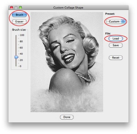 Более того, приложение позволяет создать коллаж на основе произвольной формы, причем форму можно выбрать как из перечня предлагаемых изображений, так и на основе фотографии (рис. 3). Также возможно нарисовать собственную форму от руки, используя инструменты рисования Brush и Eraser.
