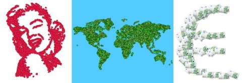 Программа позволяет дублировать исходные изображения серии, поэтому нет необходимости создавать большое число исходных фотографий. Учитывая данную особенность, можно создать коллаж на основе всего лишь одной фотографии. Так, например, на рис. 4 в коллаже, созданном на основе фотографии Мэрилин Монро, использовалось 2000 копий; для коллажа, созданного из физической карты земного шара, - 3000 копий, а для коллажа, созданного из нарисованного от руки знака евро - 50 копий.