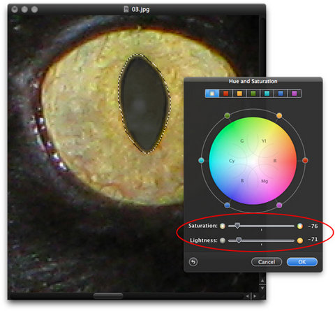 Рис. 7. Обесцвечивание и затемнение зрачка с помощью диалогового окна Hue and Saturation
