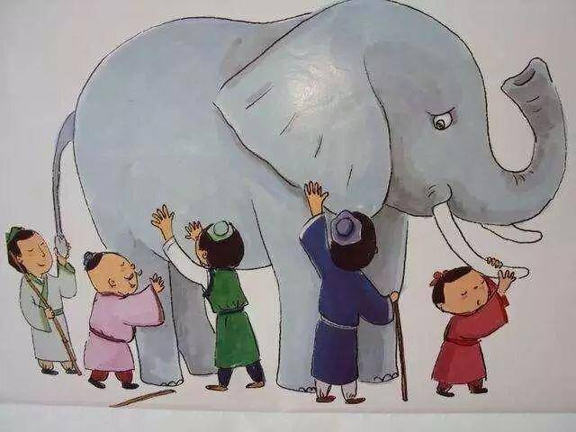 Поскольку слон большой, разным людям достались разные части слоновьего тела. И, потрогав слона, слепые начали описывать ощущения. «Слон это как большая морковь», сказал тот, кому под руки попал бивень. «Нет же, слон это гладкий шелковый веер», заявил тот, кто щупал ухо. «Глупости, слон это стена, огромная и крепкая», этот лапал туловище. «Что вы такое говорите? Слон это колонна!», не соглашался с предыдущими ораторами тот, кому досталась нога. «Да нет же, слон он как веревка», сжимая хвост, утверждал пятый из них.
