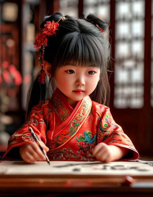 А на следующий день у меня состоялась другая фотосессия. Для «Шелеста осенних листьев». В прелестнейшем детском ханьфу. За моим излюбленным занятием каллиграфией.