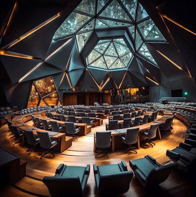 Архитектор, кажется, переосмыслил идею круглого стола на много столов, расходящихся кольцами. Или колец Сатурна, у меня почему-то такая родилась ассоциация. Прозрачный потолок, геометрические узоры на стенах Впечатлял зал, нечего сказать.