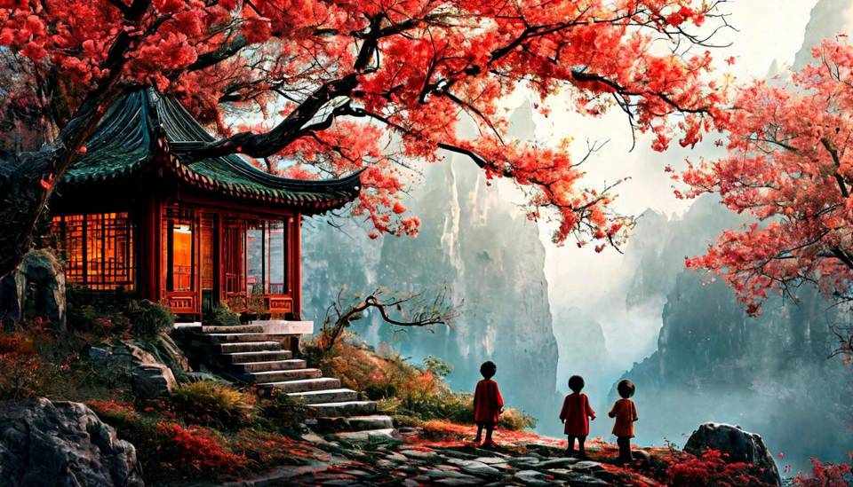 Чтобы узнаваемо, читаемо, но не прямое копирование. Завершим же «попаданческую» часть троицей главных героев, любующихся цветением зимней сливы на фоне величественных гор. Куньлунь или других оставим додумывать зрителю.