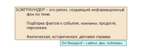 Background фон, задний план, задник. Backgrounder, соответственно, информационное сообщение, содержащее фоновую, сопутствующую фактуру, досье. Это информационная справка о компании или организации, которая содержит краткие, но достаточно полные сведения о компании или организации, и может быть использована журналистами при подготовке материала. Собственно, в этом и назначение бэкграундера дать основную справочную информацию. Естественно, эта информация должна не только сочетать полноту и краткость, но и быть интересной.