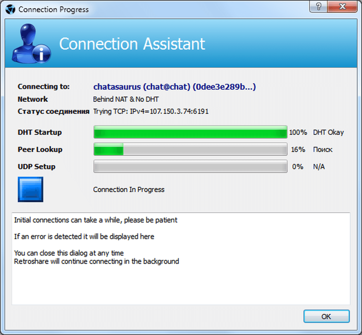 Появляется окно прогресса подключения. Можно жать «OK», подключение к пиру будет проходить в фоновом режиме.