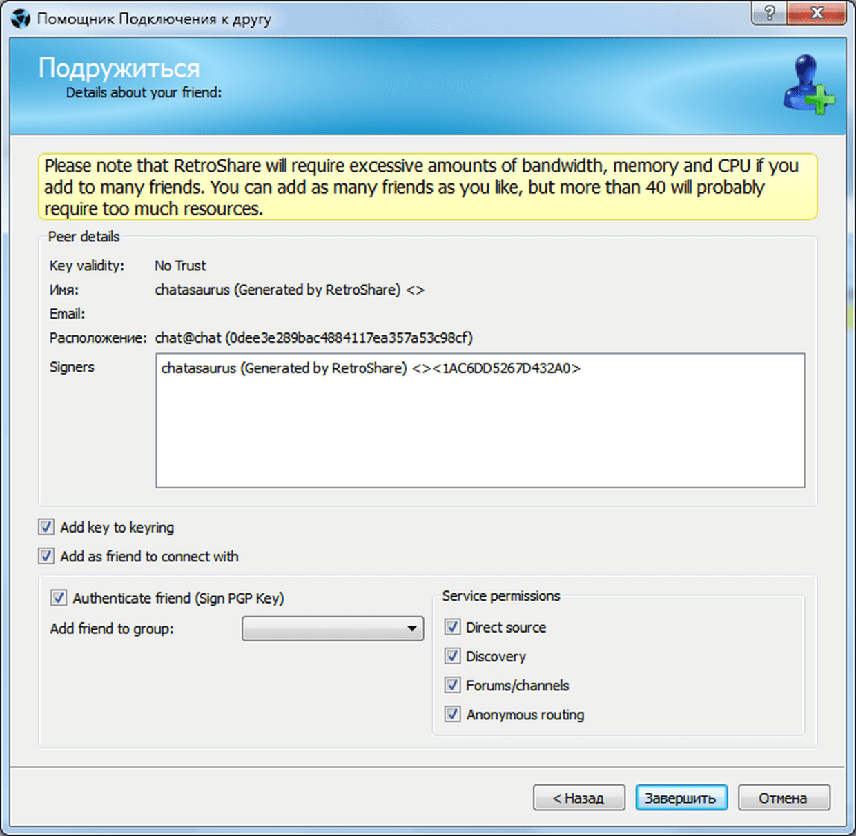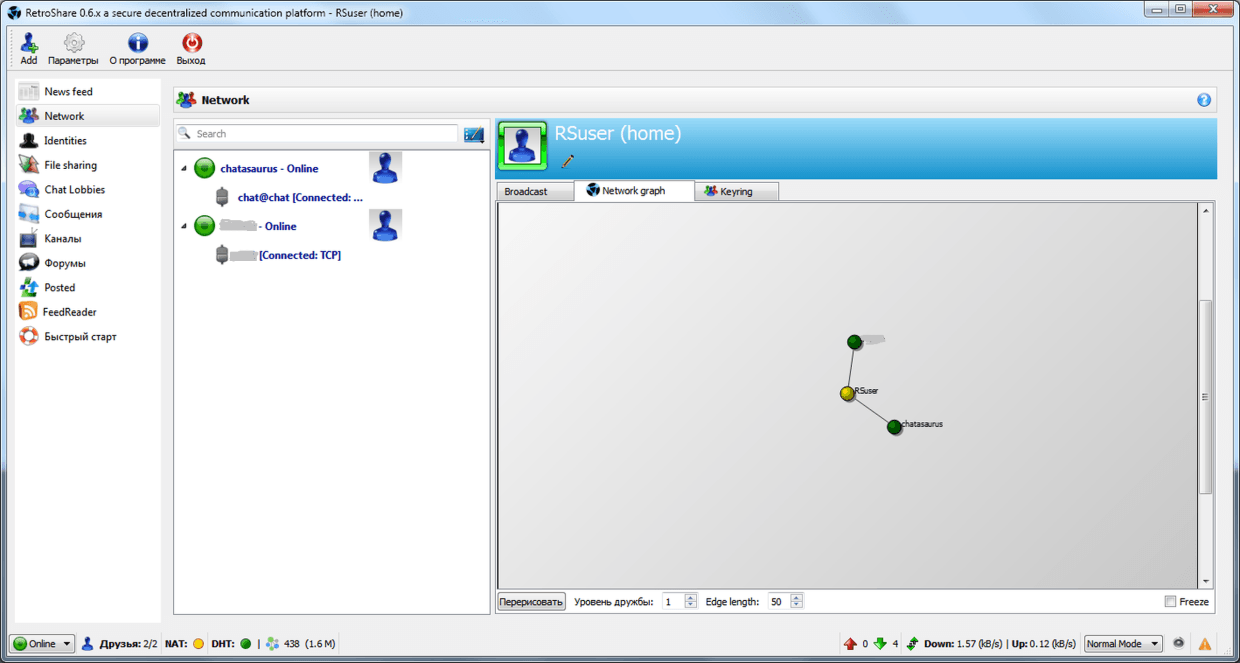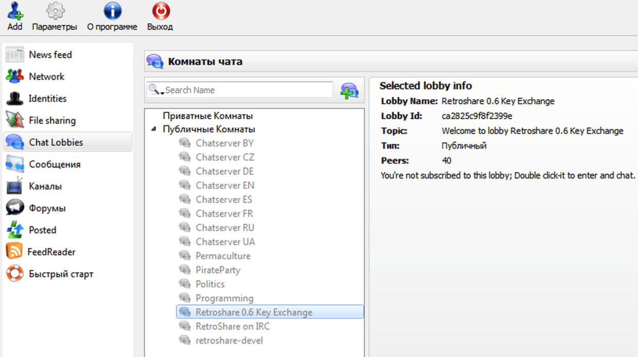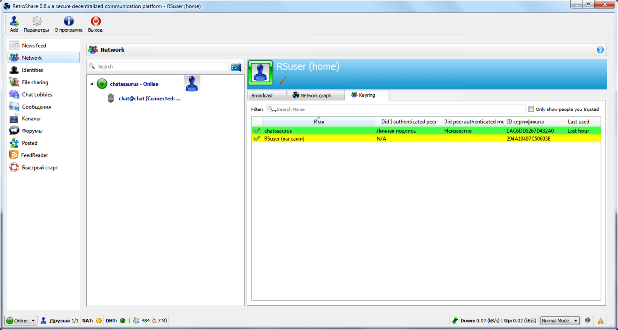 Теперь можно подписываться на чат-комнаты. На этапе поиска доверенных узлов главный для нас чат Retroshare 0.6 Key Exchange: