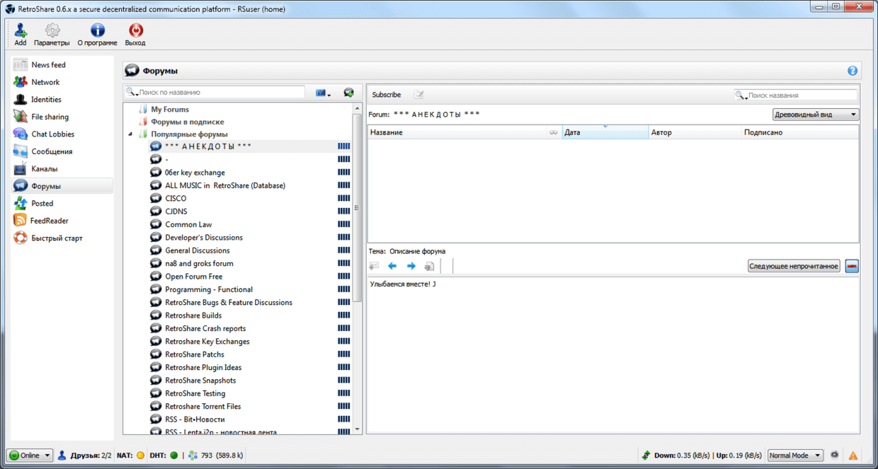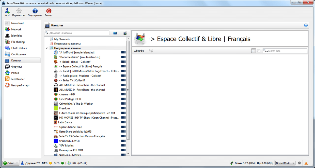 Следует отметить, что на начальном этапе подключения к анонимной криптосети загружаются лишь списки контента, но не сам контент. Для того, чтобы каналы или форумы приносили с собой контент, на них следует подписаться, щёлкнув правой кнопкой мыши и выбрав пункт «Subscribe».