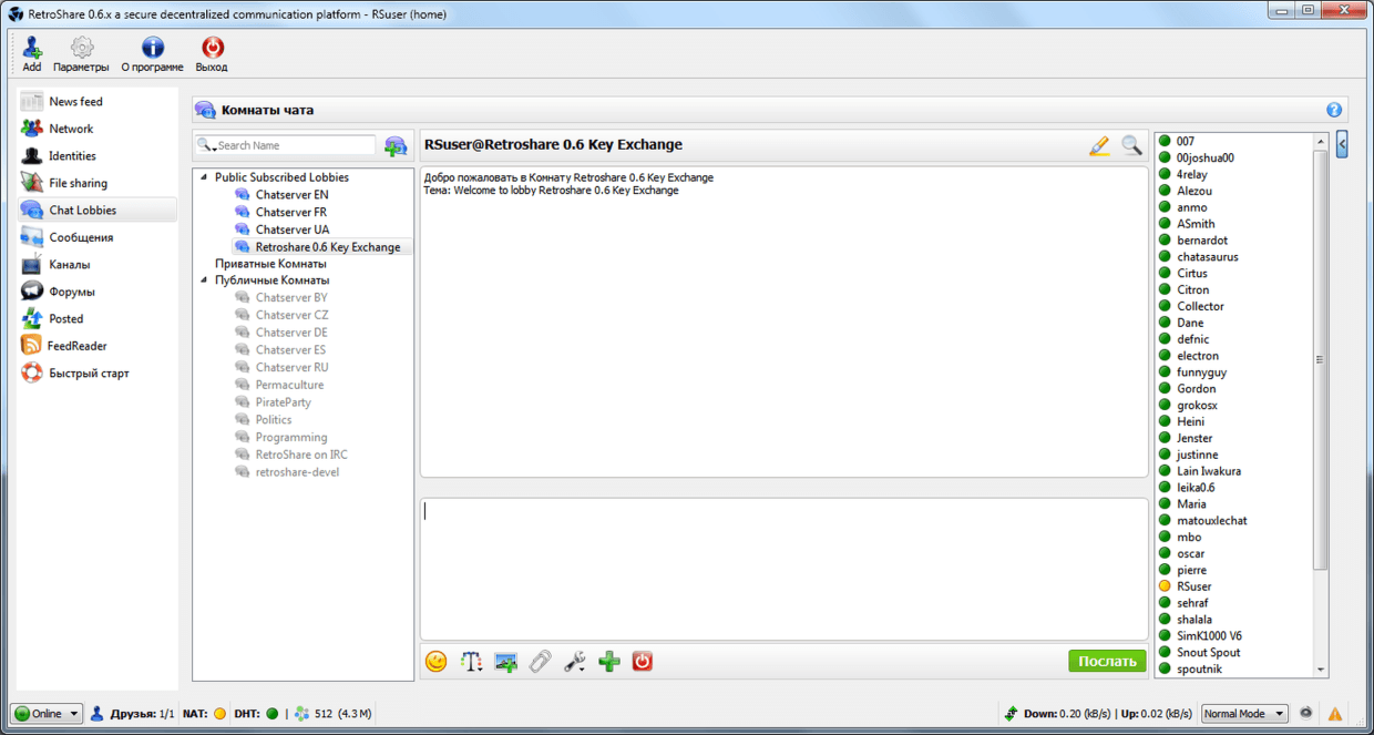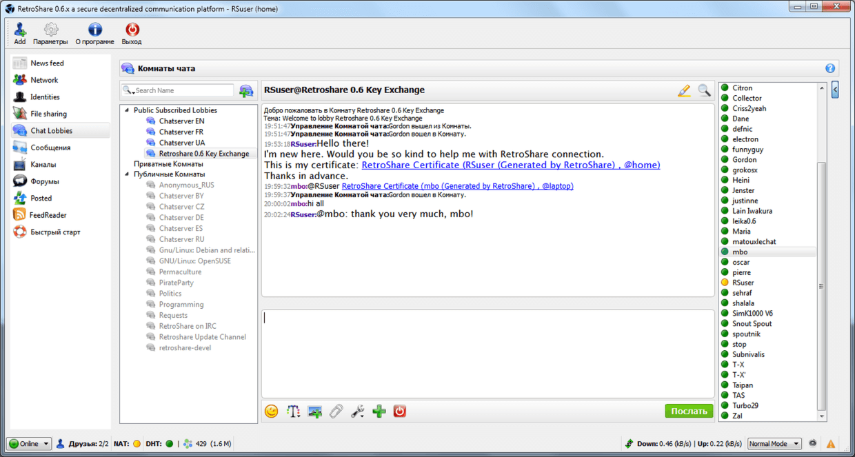 В этом чате находятся весьма дружелюбные пользователи, которые будут рады помочь вам подключиться к анонимной платформе RetroShare.