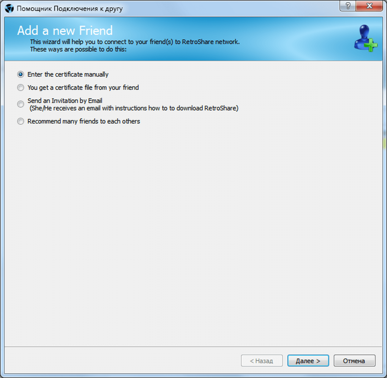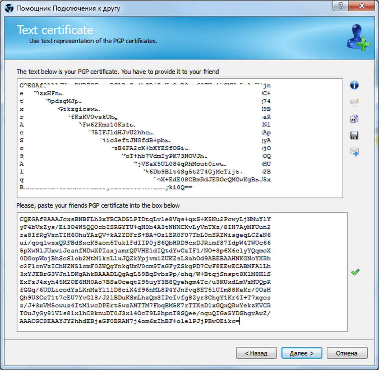 Копируем предоставленный сертификат в буфер обмена, переходим к программе и жмём кнопку, вызывающую помощника добавления друзей (кнопка Add вверху слева).
