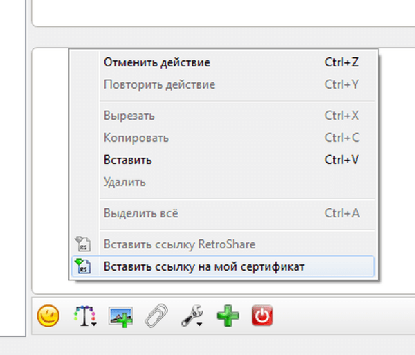 Ссылка на личный сертификат вставляется в чат по щелчку правой кнопки мыши в поле набора текста и выбору пункта Вставить ссылку на мой сертификат.