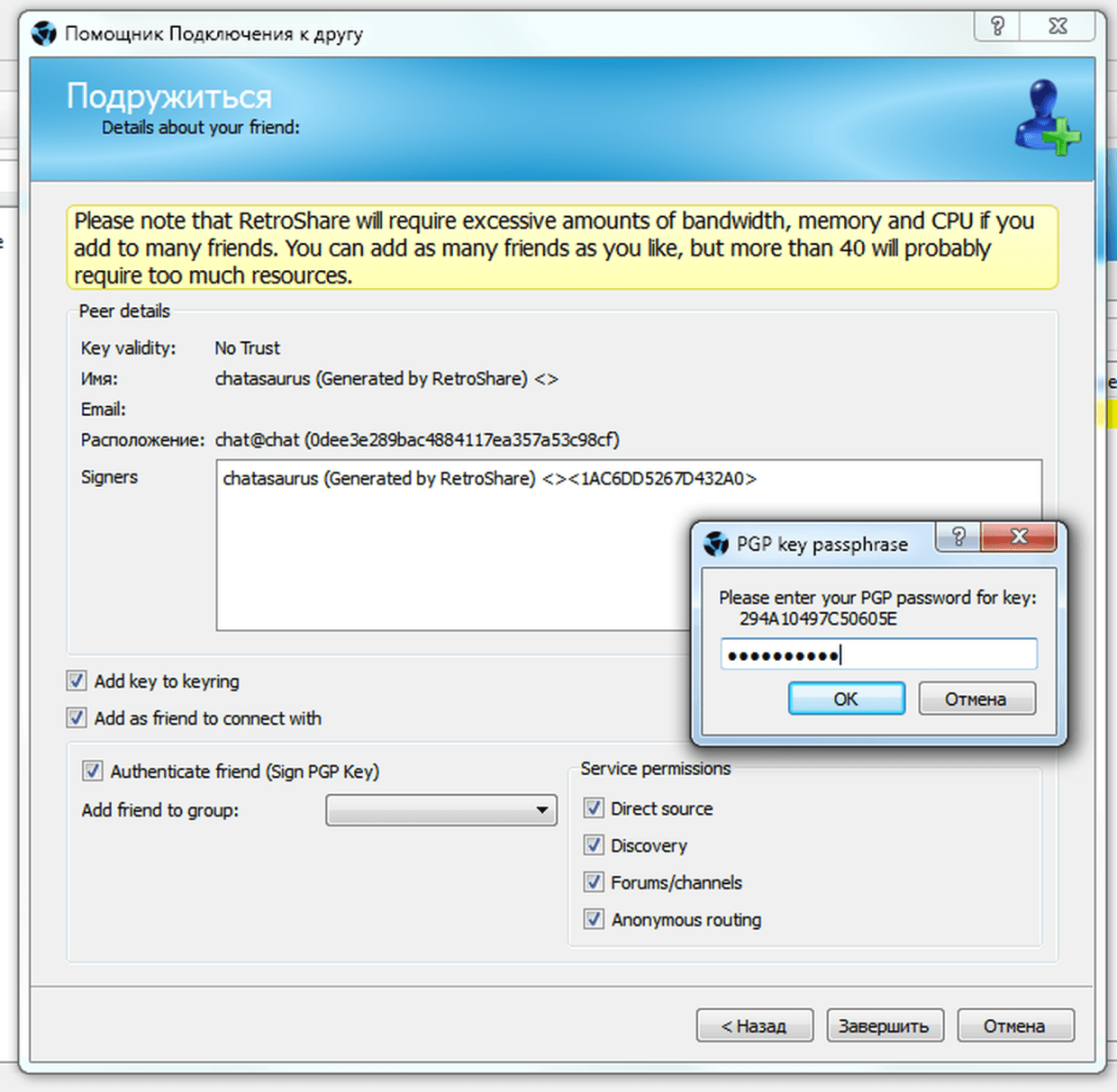 Устанавливаем галку «Authenticate friend (sign PGP key)»: