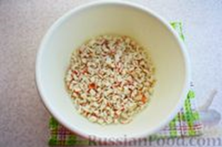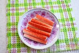 Оставшиеся крабовые палочки нарезаем маленькими кубиками. Выкладываем в миску.