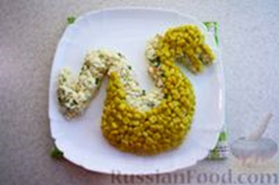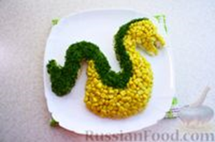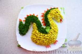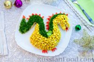 На большое блюдо выкладываем салат, формируя тело дракона.