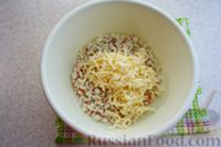 Плавленый сырок натираем на средней тёрке и добавляем к крабовым палочкам.