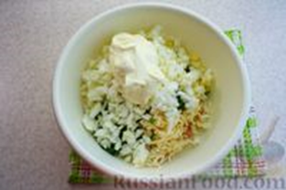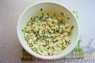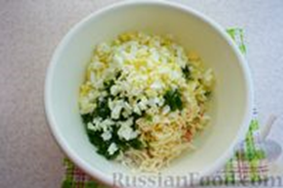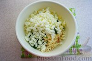 Яйца очищаем от скорлупы и нарезаем маленькими кубиками. Добавляем яйца в миску к остальным ингредиентам.