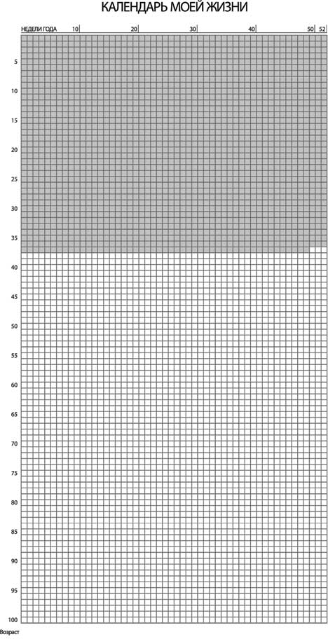 По сети гуляет «Календарь жизни»: лист в клеточку, где строчки обозначают недели, столбцы годы, а каждая ячейка 7 дней. Задача: зачеркнуть то количество клеточек, которое соответствует вашему возрасту. К примеру, мой календарь выглядит следующим образом.