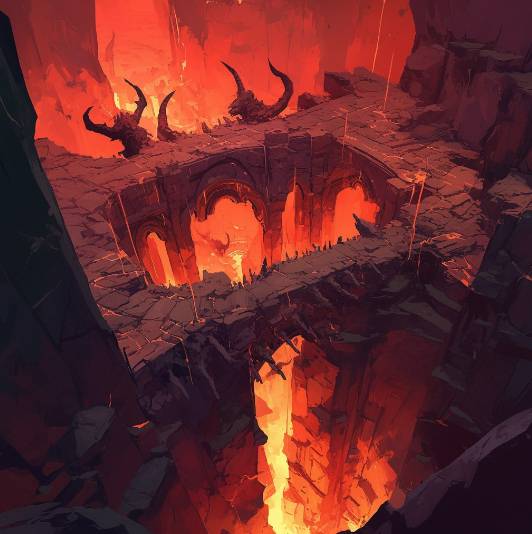 Передо мной вырастают руины посреди огненного ада и кажется, что здесь есть кто-то интересный. Глазами я не вижу с уступа ничего интересного на двойном мосту через ущелье с лавой, но «Сенсорика» заметила мощный источник сигнала где-то рядом.