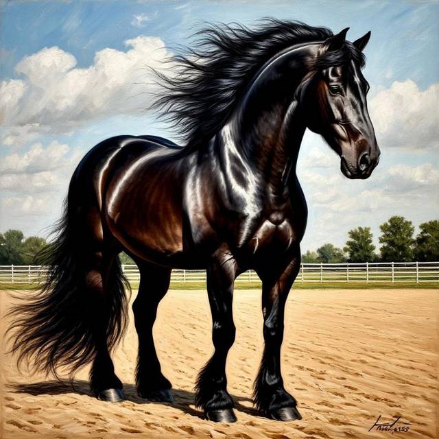 Когда мы подошли к загону, который оказался значительно мощней и выше других, я подошла почти вплотную и стала любоваться. Вороной гигант отливал синевой в лучах дневного солнца, длинная грива слегка колыхалась от ветра, что подчёркивало эпичность картины.