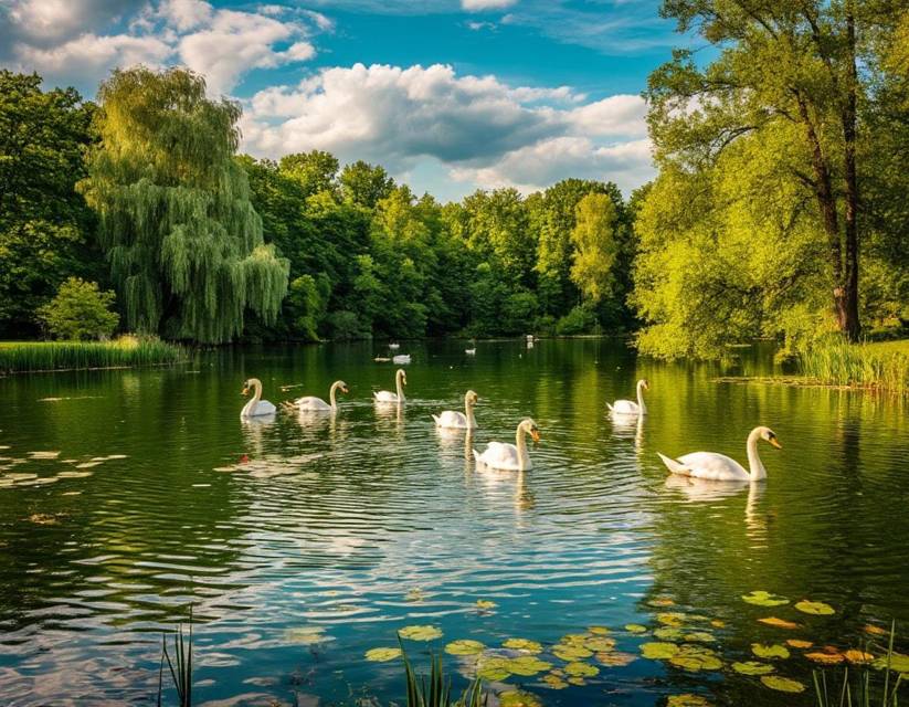 Мы всё же решили прогуляться вдоль пруда и посмотреть на лебедей, для этого пришлось уйти в сторону, там была тихая заводь в которой и плавали величественные красавцы. Наблюдение за ними подняло настроение.