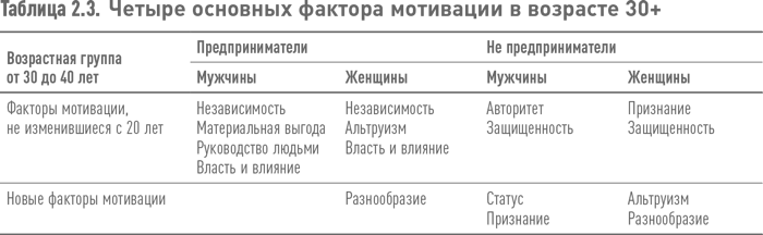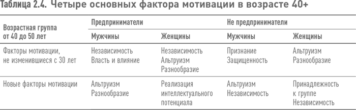 отметить, что с возрастом для мужчин-предпринимателей повышается значение альтруизма (который они начинают ценить на 20 лет позже женщин) и разнообразия.