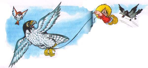 Да и Кузька не лыком шит. Быстро сделал из пояска петлю, прицелился, да и зацепил им лапу огромной птицы. Та даже от неожиданности цыпленка выпустила. Хорошо выпустила, удачно, прямо на кучу свежескошенной травы, так что малыш даже не ушибся. А вот домовенок не успел на эту кучу прыгнуть. Он же не знал, что птица так быстро цыпленка выпустит, вот и не рассчитал маленько. А потом прыгать уже поздно было. Потому что птица высоко поднялась, падай не падай, никакие стожки не помогут…