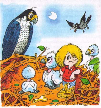 Птенцы так удивились, что этот лохматый зверек, вместо того чтобы пугаться, ими командует, что испугались сами и стали его слушаться. Солнце совсем немного по небу проскользнуло, как в гнезде полный порядок наступил. Вытер Кузька птенцам носы, крылышки им расправил, когти почистил. Сидят птенцы на перинке чистые, красивые, причесанные. А тут и птица прилетела.