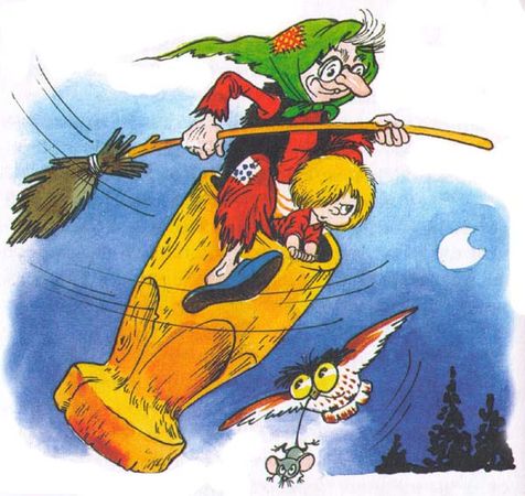 Правда, он скоро опомнился. Открыл глаза, осмотрелся и увидел прямо перед своим носом крючковатый нос Бабы Яги. Летит Яга в ступе, помелом рулит.
